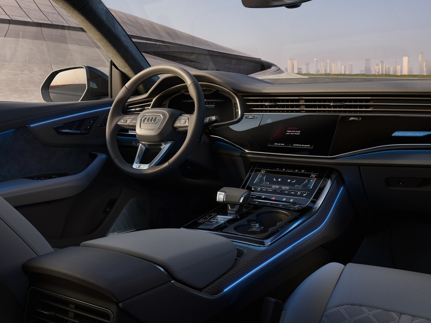 The dashboard of the 2026 Audi SQ8 is covered by responsive screens that make it easy to navigate menus and adjust settings. The infotainment screen measures 10.1 inches and includes smartphone connectivity, making it easy to listen to your favorite songs. The climate control panel sits underneath the infotainment screen, offering an 8.6-inch panel to optimize the comfort of your cabin. Upgrade to the Bang & Olufsen 3D premium sound system for an unparalleled listening experience.
